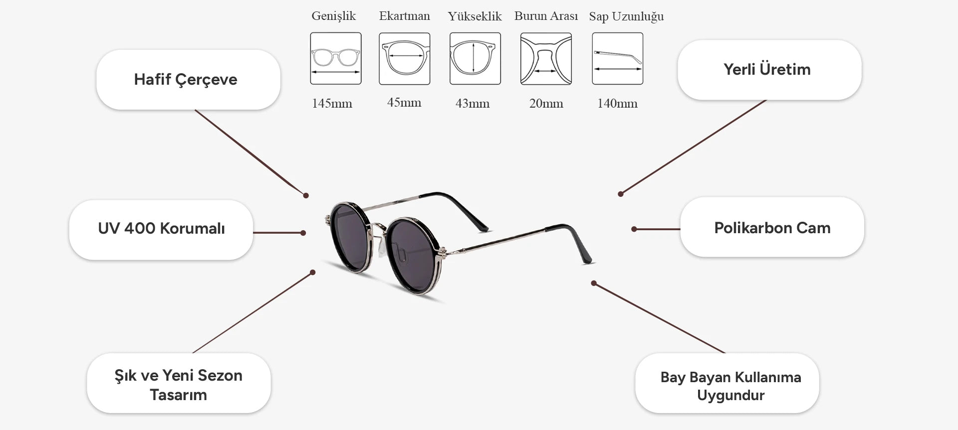 ✅ Tam Koruma: UV400 koruması sayesinde gözlerinizi zararlı UVA ve UVB ışınlarından maksimum seviyede korur. Güneşin zararlı etkilerini engelleyerek net ve konforlu bir görüş sunar.