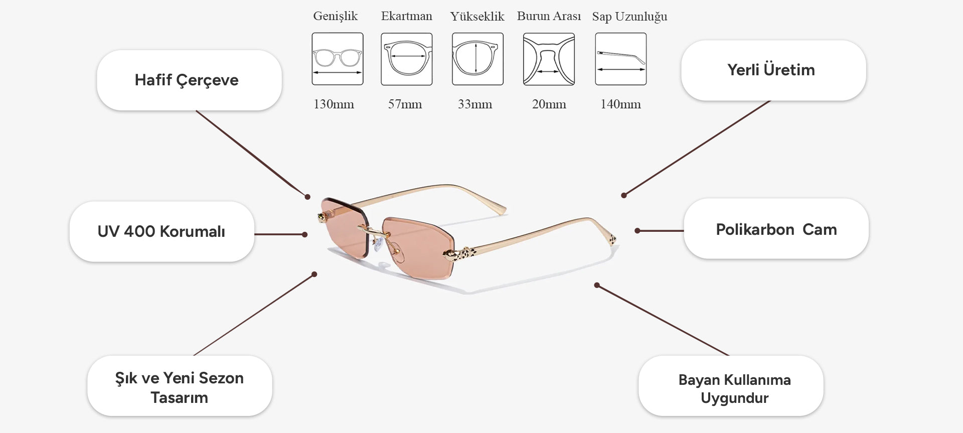GETTO DERİ gözlüklerinde kullanılan camlar, netlik, dayanıklılık ve zarif bir görünüm anlayışıyla tasarlanmıştır. Gün ışığı ve çevresel ışık koşullarında daha dengeli bir görüş deneyimi sunmaya yardımcı olurken, tasarımın doğal şıklığını ön plana çıkarır. Hafif yapısı ve konfor odaklı formu sayesinde gün boyu rahat bir kullanım sunar.