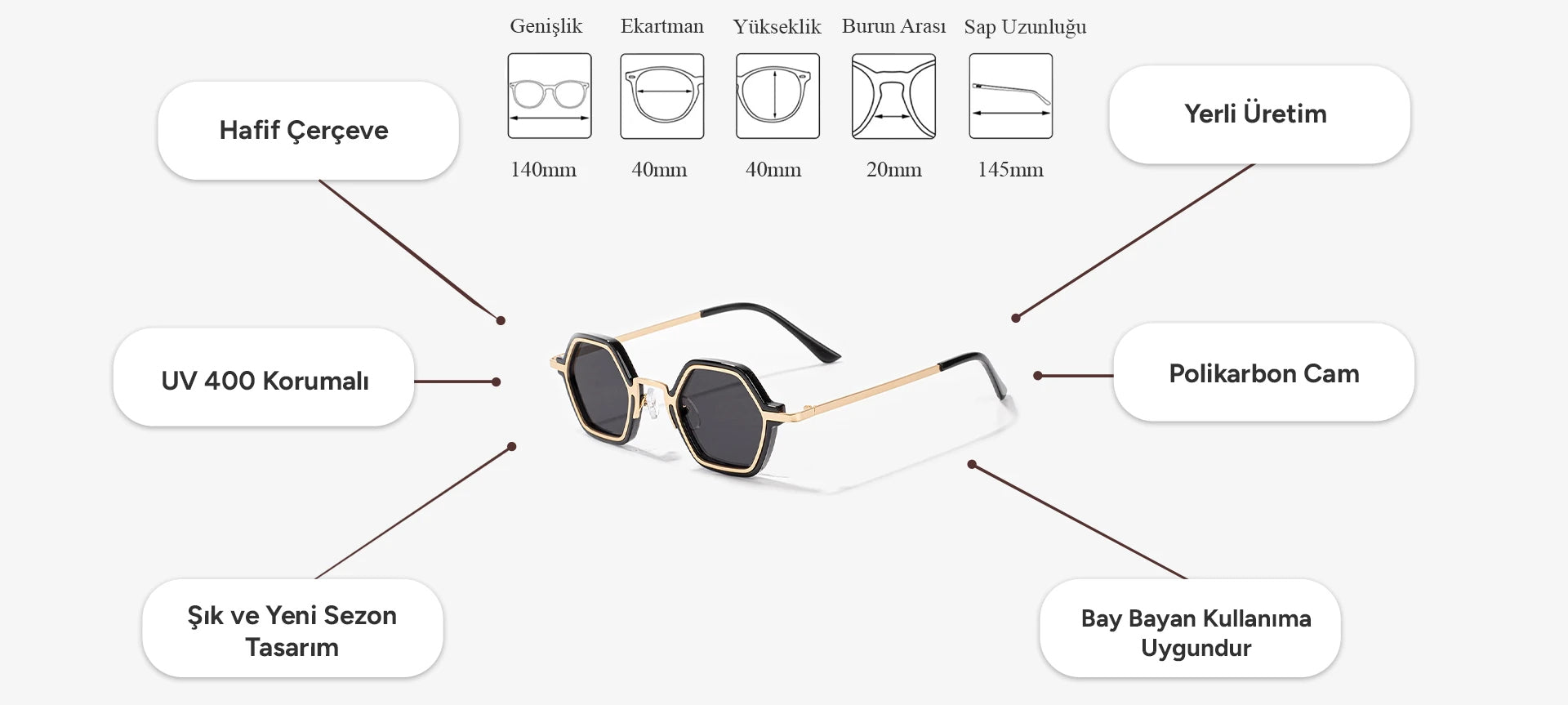 ✅ Tam Koruma: UV400 koruması sayesinde gözlerinizi zararlı UVA ve UVB ışınlarından maksimum seviyede korur. Güneşin zararlı etkilerini engelleyerek net ve konforlu bir görüş sunar.