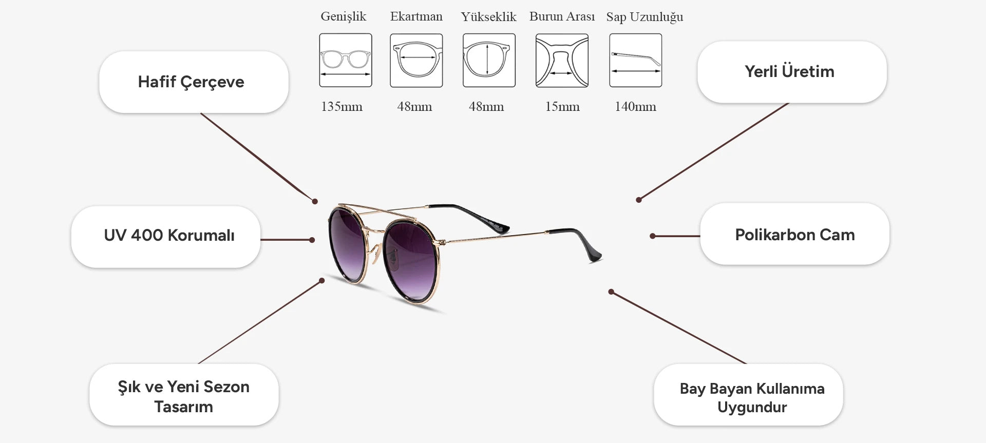 ✅ Tam Koruma: UV400 koruması sayesinde gözlerinizi zararlı UVA ve UVB ışınlarından maksimum seviyede korur. Güneşin zararlı etkilerini engelleyerek net ve konforlu bir görüş sunar.