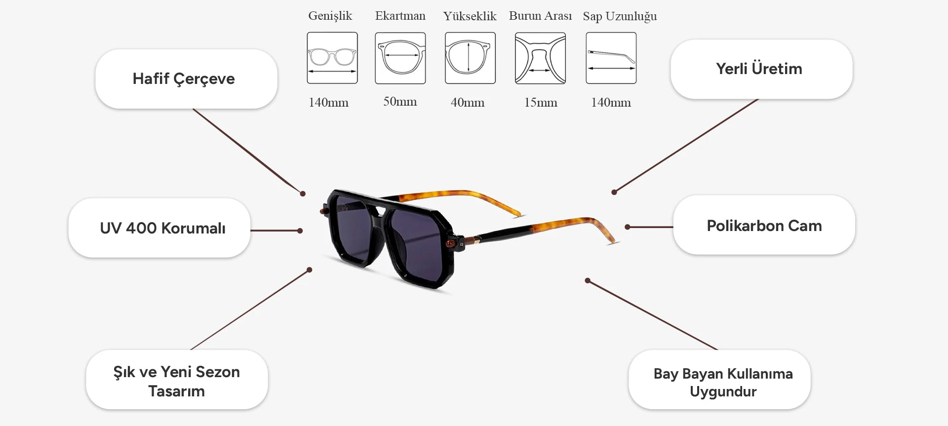 ✅ Tam Koruma: UV400 koruması sayesinde gözlerinizi zararlı UVA ve UVB ışınlarından maksimum seviyede korur. Güneşin zararlı etkilerini engelleyerek net ve konforlu bir görüş sunar.